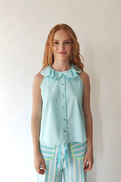 Eine ärmellose Bluse, die dafür gedacht ist, dich im Sommer mit Leichtigkeit und Charme zu begleiten. Sie besticht durch den Volant am Hals, der das Gesicht umrahmt und einen besonderen Akzent setzt. Der vordere Verschluss mit kleinen Knöpfen und der gerade Schnitt schaffen eine bequeme und schmeichelhafte Silhouette, perfekt für die wärmeren Tage.