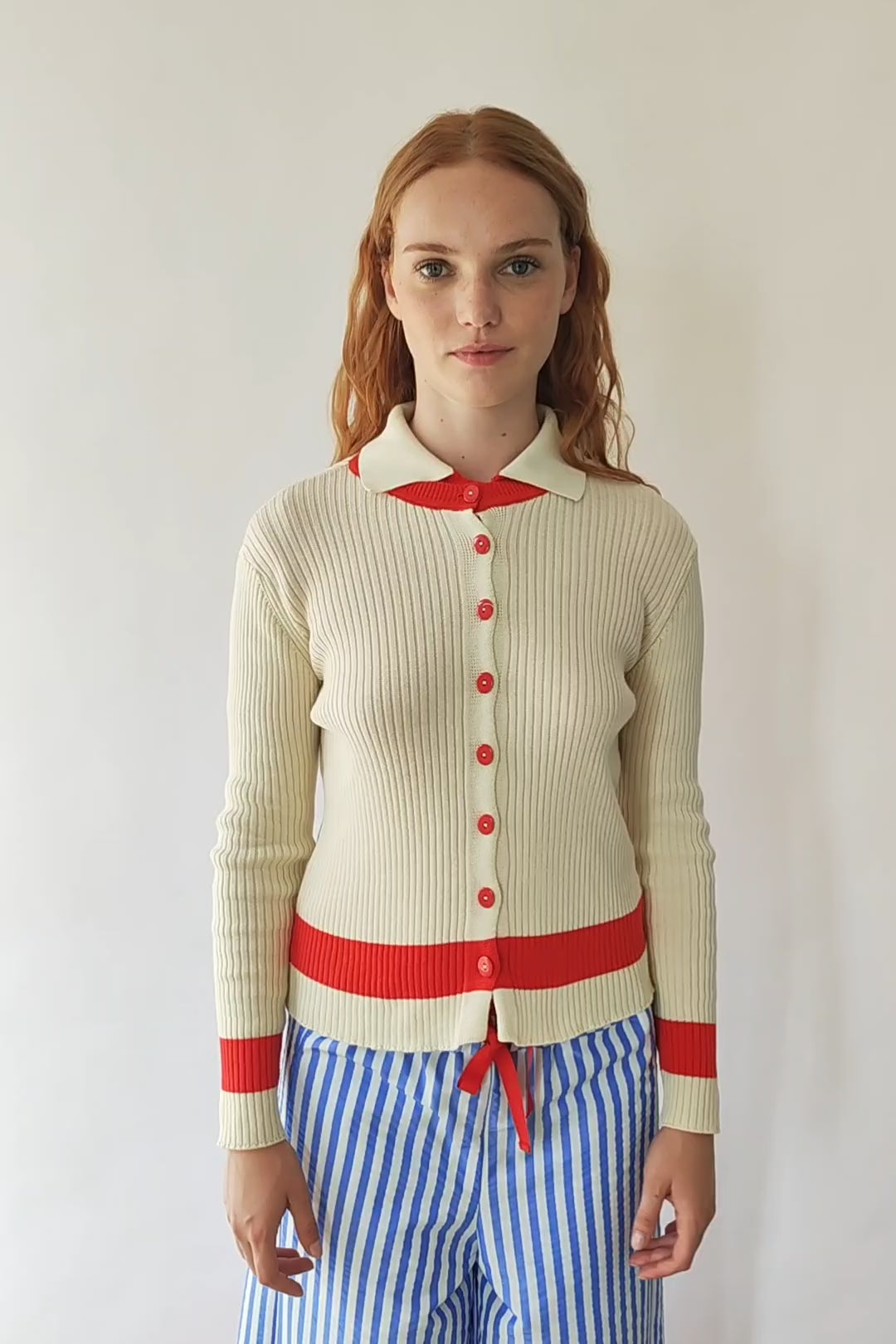 Eine Strickjacke, die Klassik mit einem lässigen Touch verbindet. Ihr grob gerippter Stoff in Naturfarbe ist weich und schmeichelhaft, während die roten Details – am Kragen, an den Bündchen und am Saum – Licht und einen ganz besonderen Kontrast verleihen. Die vorderen Knöpfe vervollständigen den Look mit einem charmanten Vintage-Flair.
