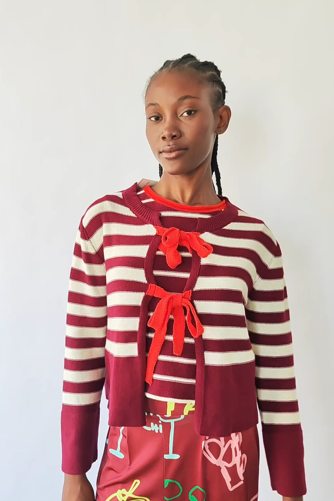 Eine Strickjacke, die Romantik und Farbe auf die typisch Bloom'sche Weise vereint. Das Streifendesign in Bordeaux und Naturweiß verleiht einen klassischen Touch, während die vorderen Schleifen in lebhaftem Orangeton einen unerwarteten und persönlichen Akzent setzen.