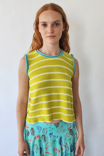 Un haut léger et polyvalent qui combine des rayures jaune clair avec des lignes blanches et des finitions dans un vibrant vert d'eau. Son design en maille, sans manches, et sa silhouette droite en font un vêtement confortable et facile à porter, parfait pour créer des looks frais tout au long de l'année.