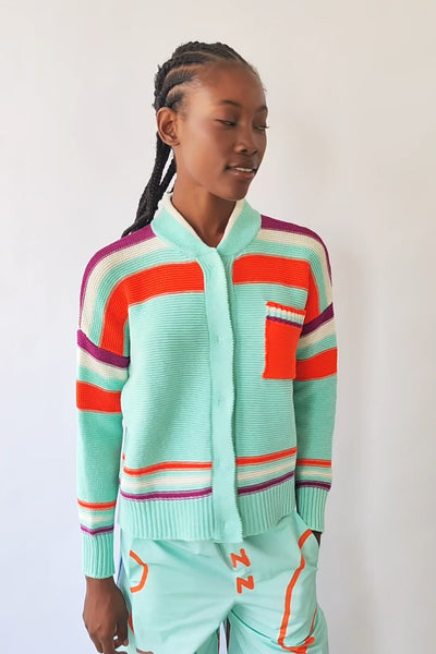 De silhouette décontractée et en coton agréable, qui mélange des rayures de couleurs dans des tons orange, aubergine et écru sur un fond bleu-vert. La poche avant contrastante ajoute une touche ludique et fonctionnelle qui rompt la symétrie de manière naturelle.