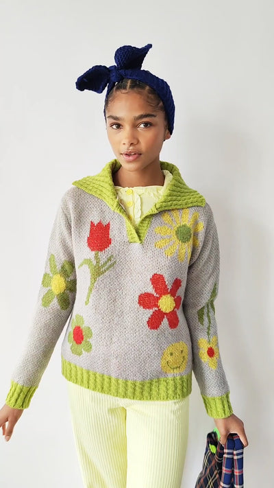 Maglia grigia con jacquard di maxi fiori in tonalità giallo, verde e rosso. Collo alla marinara, taglio dritto e manica lunga. Dettaglio di finiture a punto treccia su polsini, orlo e collo. Tessuto piacevole e soffice in misto lana.