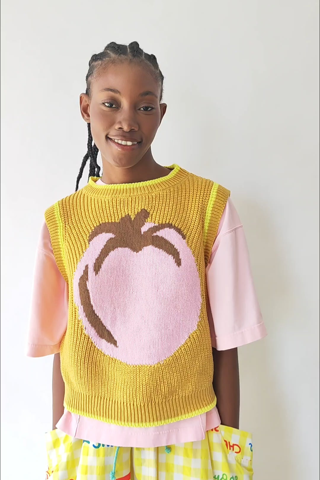 Un chaleco que no pasa desapercibido. Con un gran tomate en color rosa con detalles en marrón, como protagonista sobre fondo en mostaza, esta prenda es una auténtica declaración de amor al color y al humor mediterráneo. Los remates en amarillo en cuello, sisas y bajo aportan un contraste fresco y vibrante que lo hace aún más especial.
