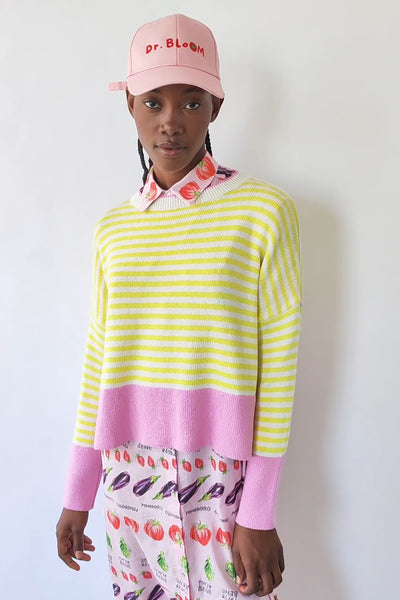 Un clásico renovado al estilo Bloom. Este jersey de rayas amarillas y blancas incorpora un toque moderno gracias a los detalles en color rosa presentes en el bajo, los puños y el ribete del cuello. El resultado es una combinación fresca, vibrante y muy favorecedora.