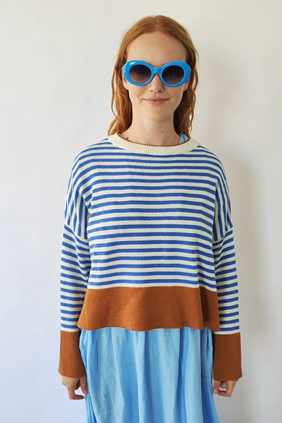 Un clásico renovado al estilo Bloom. Este jersey de rayas azules y blancas incorpora un toque moderno gracias a los detalles en color camel presentes en el bajo, los puños y el ribete del cuello. El resultado es una combinación fresca, cálida y muy favorecedora.